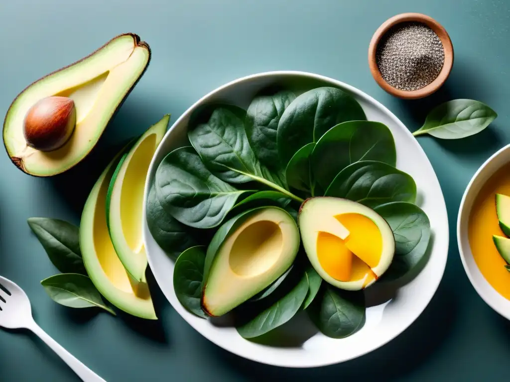 Una composición detallada de alimentos keto ricos en magnesio, como espinacas, almendras, aguacate y semillas de chía, dispuestos en una elegante bandeja con suave iluminación natural
