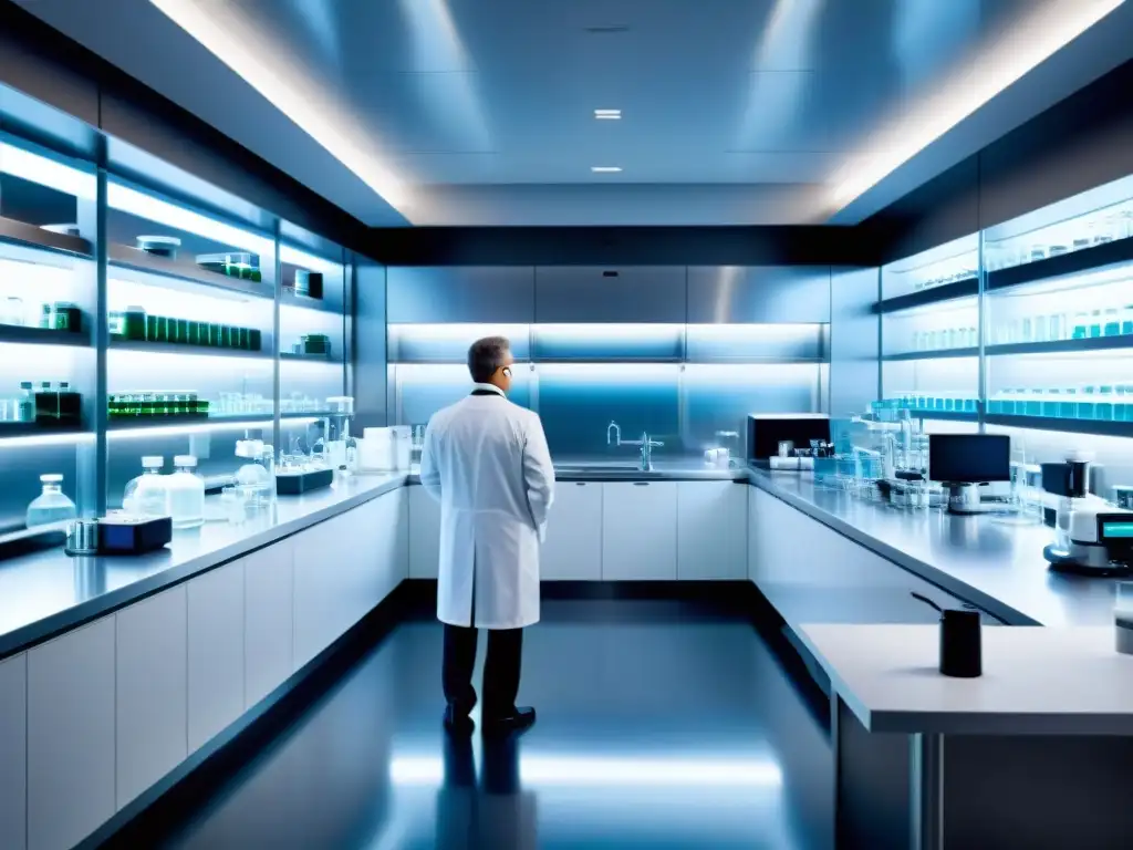 Un laboratorio moderno y elegante con filas de viales de vidrio organizados y líquidos translúcidos
